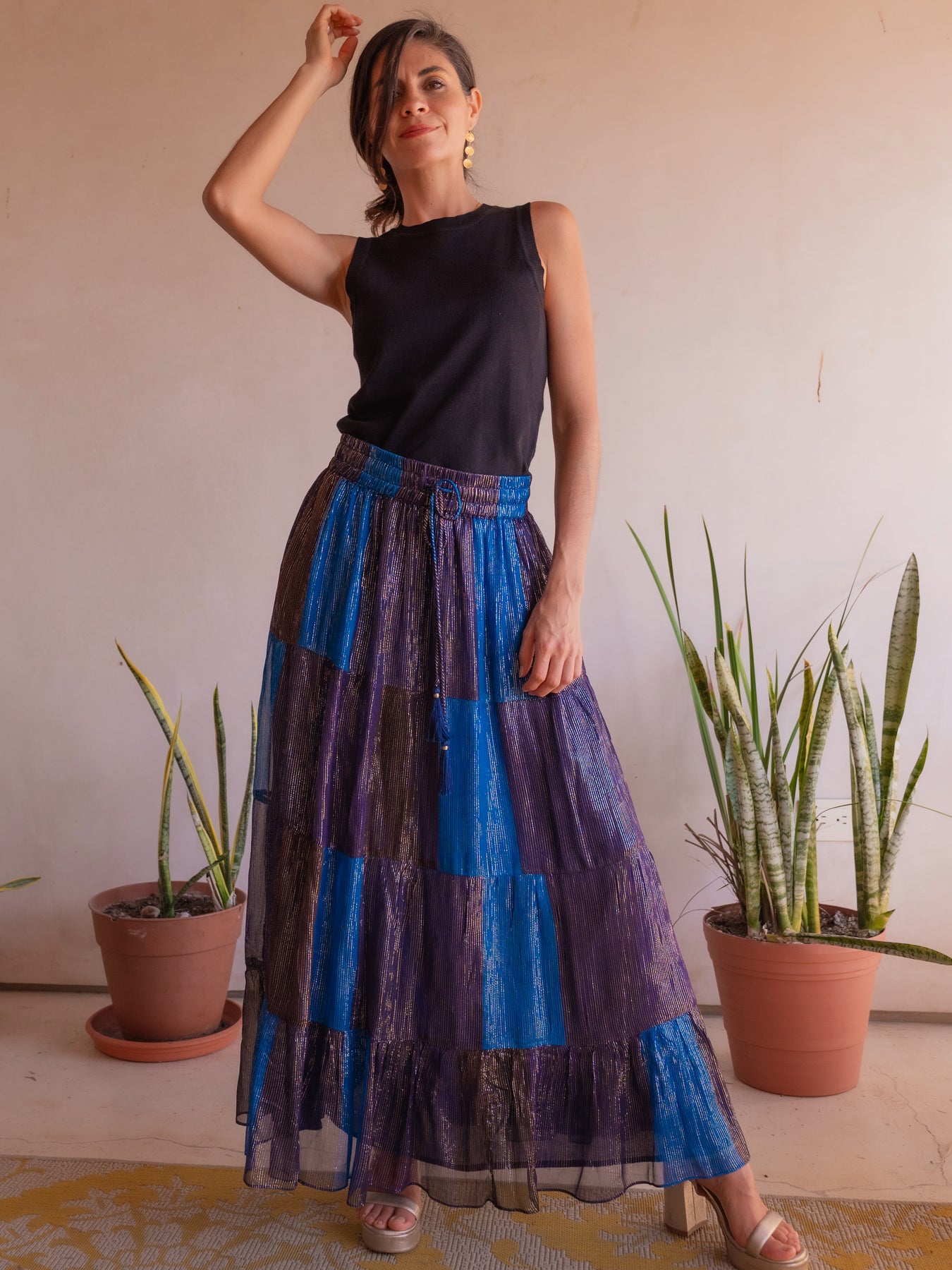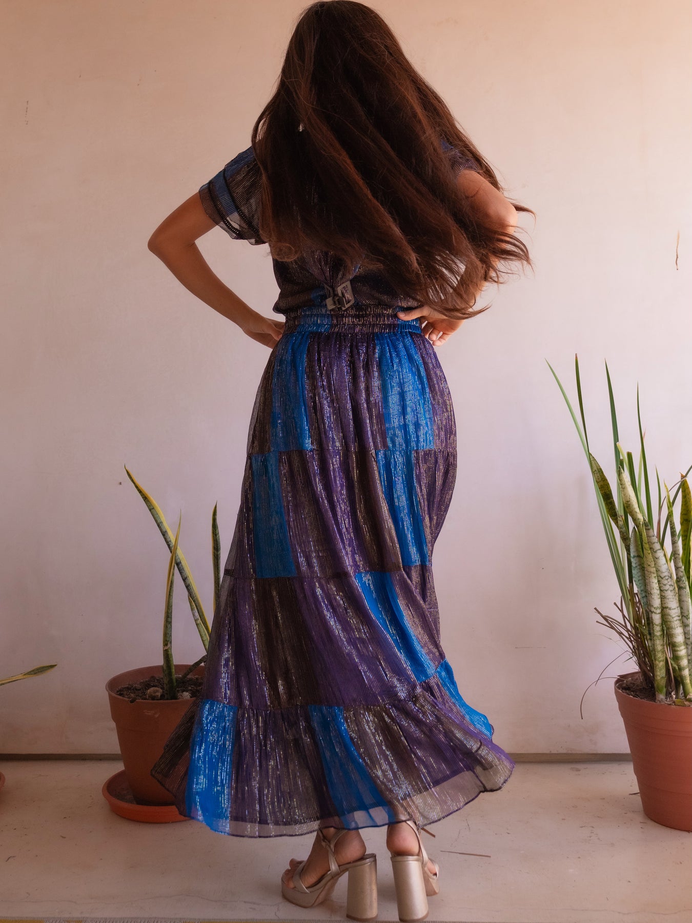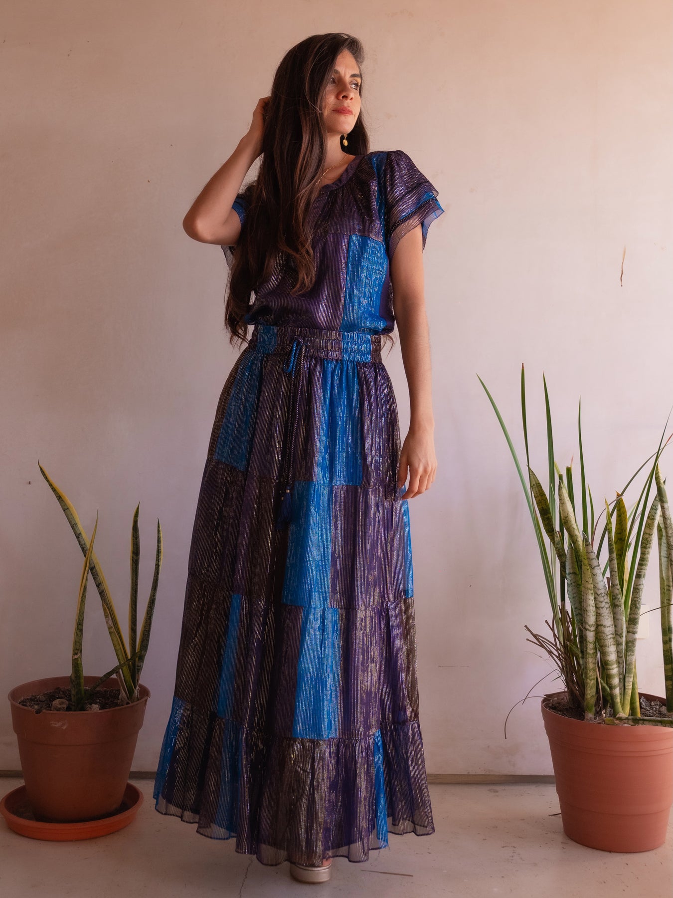 Turn heads in our Sunset Maxi Skirt, a flowing boho chic chiffon skirt designed for effortless elegance from day to night. Featuring rich sunset-inspired hues with a subtle gold and silver lurex stripe, this lightweight rayon chiffon maxi skirt creates beautiful movement and a flattering silhouette for every body type.